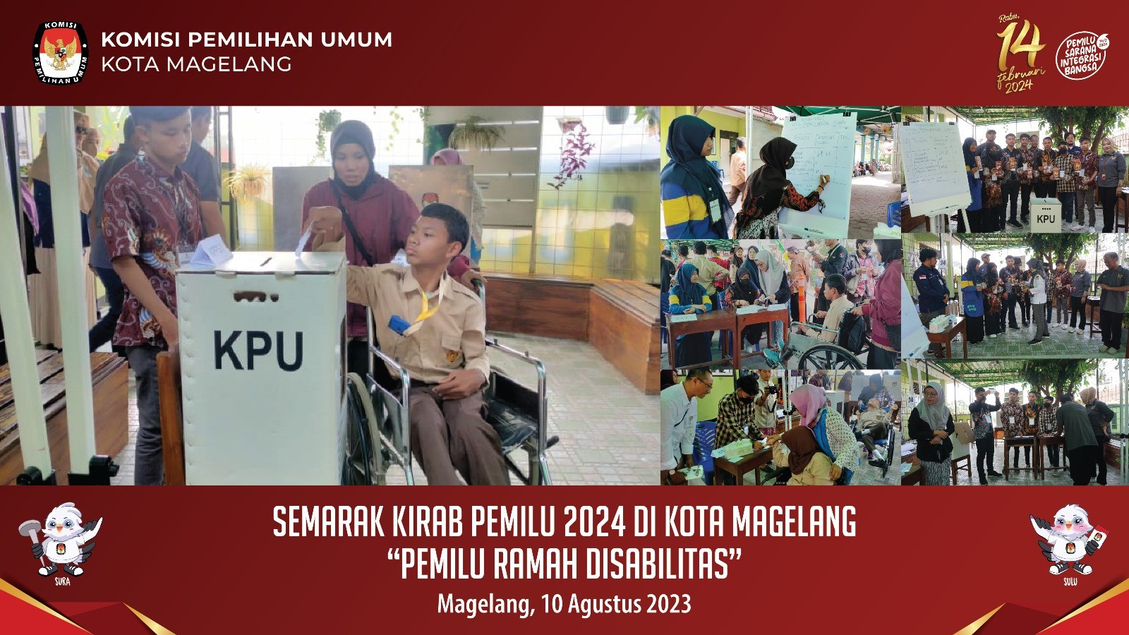 Magelang, kota-magelang.kpu.go.id. KPU Kota Magelang bersama PPK  Magelang Utara menggelar kegiatan Semarak Kirab Pemilu 2024 “Pemilu Ramah Disabilitas” di SLB Negeri Kota Magelang, Kamis (10/8/2023). Acara terdiri dari sosialisasi pemilu 2024, lomba mewarnai, pentas seni, simulasi pemungutan dan penghitungan suara dan layanan cek DPT online. Lomba mewarnai diikuti 83 orang peserta yang merupakan siswa SLB Negeri Kota Magelang. Lomba terbagi dalam tiga kategori, yakni tunarungu, tunagrahita ringan dan tunagrahita sedang. Peserta lomba diberikan waktu 90 menit untuk menyelesaikan lomba. Pemenang lomba mandapat hadiah trophy dan bingkisan menarik. Di tengah-tengah aktivitas lomba, tim kirab KPU Kota Magelang menyampaikan informasi pemilu 2024 dan membagikan bahan sosialisasi kepada para wali murid yang hadir mendampingi peserta lomba. Acara pentas seni berlangsung tak kalah meriahnya, yang dibawakan oleh siswa-siswa dan guru SLB Negeri Kota Magelang. Aneka pentas yang ditampilkan yaitu menyanyi, pantomin yang bercerita tentang tolak politik uang dan ajakan untuk ikut pemilu, tari rampak, dan tari warok. Penampilan peserta mendapat sambutan hangat dari para tamu undangan. Di saat bersamaan, dilakukan simulasi pemungutan dan penghitungan suara yang diikuti 50 orang, terdiri dari siswa SMP dan SMA. Para siswa antusias mengikuti jalannya pemungutan hingga penghitungan suara. Dalam event tersebut, bazaar karya disabilitas juga digelar dengan menjual aneka hasil produk para siswa SLB Negeri Kota Magelang, seperti tas kanvas, makanan ringan, batik, keset, dompet, cover tisu, dll.