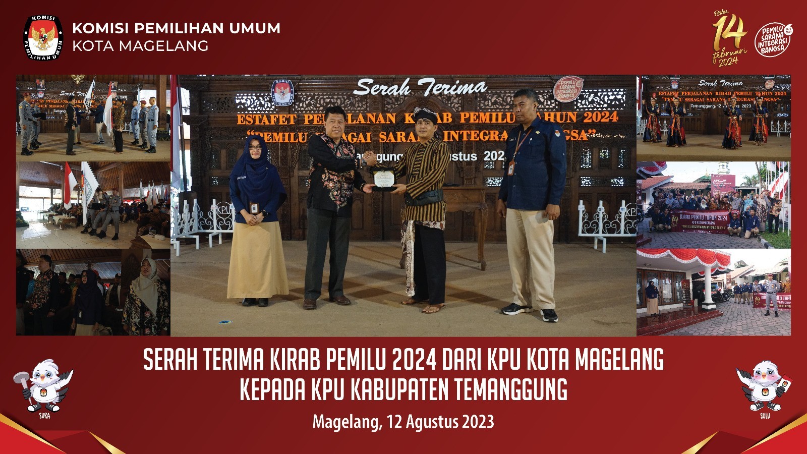 Magelang, kota-magelang.kpu.go.id. Setelah menggelar kegiatan kirab pemilu 2024 di Kota Magelang sejak 5 Agustus 2023, KPU Kota Magelang menyerahkan bendera kirab pemilu 2024 kepada KPU Temanggung, Sabtu pagi (12/8/2023). Acara serah terima berlangsung di Pendopo Pengayoman Kabupaten Temanggung. Dalam sambutannya, Ketua KPU Kota Magelang Basmar Perianto Amron mengatakan bahwa kirab pemilu adalah program KPU RI untuk meningkatkan partisipasi pemilih dalam pemilu 2024. Melalui pemilu, kata Basmar, diharapkan seluruh elemen masyarakat dapat berbahagia dengan memilih pemimpin yang diyakini mampu membawa kemakmuran bagi bangsa. Selanjutnya prosesi serah terima dilaksanakan dengan penyerahan secara simbolis bendera merah putih, bendera pataka KPU, bendera partai politik dan kotak hitam oleh Ketua, Sekretaris dan Jagatsaksana KPU Kota Magelang kepada Ketua, Sekretaris dan Jagatsaksana KPU Temanggung. Rangkaian seremoni serah terima berakhir pukul 11.30 WIB. Sebelumnya, mengawali keberangkatan menuju KPU Temanggung, KPU Kota Magelang melaksanakan apel pelepasan pada pukul 07.00 s.d. 07.30 WIB di halaman Kantor KPU Kota Magelang. Selesai apel, tim kirab KPU Kota Magelang berangkat menuju Pendopo Pengayoman Temanggung dengan waktu tempuh perjalanan ± 60 menit. Rangkaian kendaraan kirab berjumlah 10 kendaraan, dengan urutan mobil patwal, mobil KPU Kota Magelang, mobil pembawa bendera, mobil jagatsaksana dan mobil pengiring. Dalam perjalanan menuju Temanggung, sampai dengan batas Kota Magelang di sebelah utara, Tim Kirab KPU Kota Magelang mensosialisasikan pemilu 2024 dengan pemutaran Jingle Pemilu 2024.