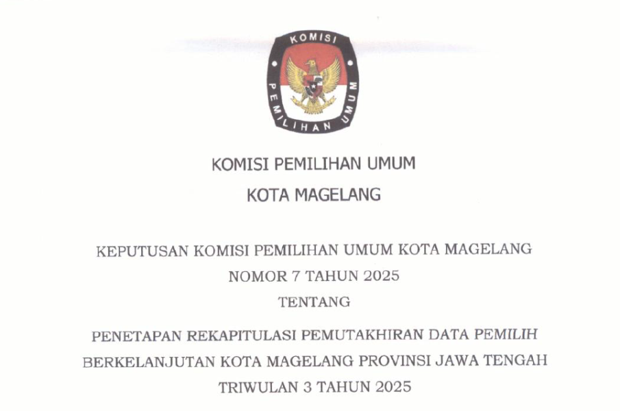 Berdasarkan Keputusan KPU Kota Magelang Nomor 7 Tahun 2025 tentang Penetapan Rekapitulasi Pemutakhiran Data Pemilih Berkelanjutan Kota Magelang Provinsi Jawa Tengah Triwulan III Tahun 2025.bersama ini disampaikan