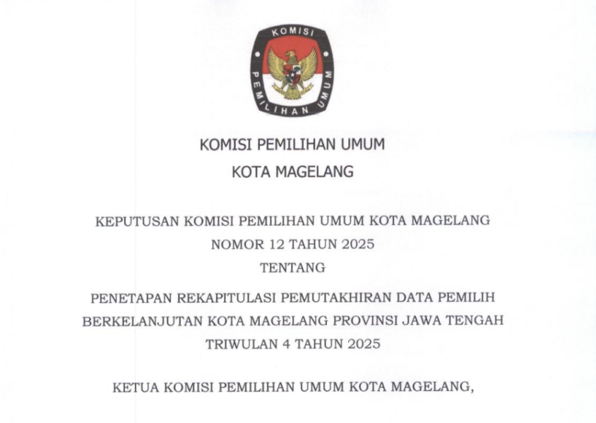 Berdasarkan Keputusan KPU Kota Magelang Nomor 12 Tahun 2025 tentang Penetapan Rekapitulasi Pemutakhiran Data Pemilih Berkelanjutan Kota Magelang Provinsi Jawa Tengah Triwulan IV Tahun 2025. Bersama ini disampaikan