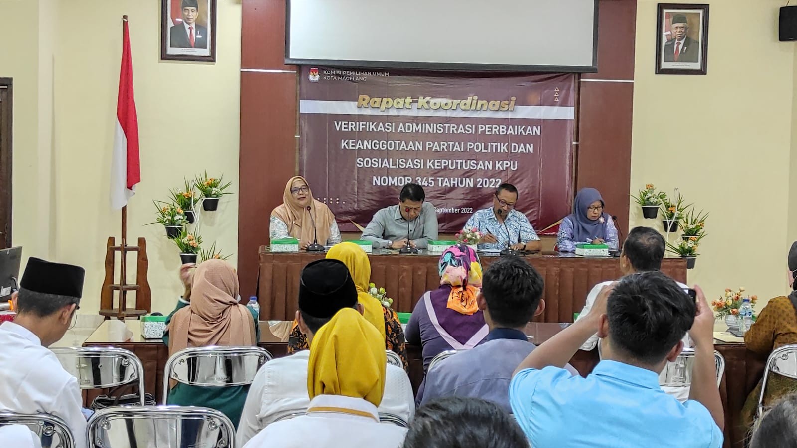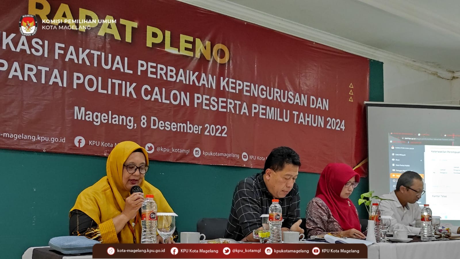 Magelang, kota-magelang.kpu.go.id. KPU Kota Magelang telah menggelar Rapat Pleno Hasil Verifikasi Faktual Perbaikan Kepengurusan dan Keanggotaan Partai Politik Calon Peserta Pemilu 2024 di tingkat Kota Magelang. Rapat pleno ini dilaksanakan secara terbuka pada Kamis (8/12/2022), di Trio Front One Resort Magelang. Ketua dan Anggota KPU Kota Magelang membacakan hasil verifikasi yang dituangkan dalam Berita Acara MODEL BA.REKAP.KPU.KABKOTA-PARPOL. Pembacaan dilanjutkan dengan penandatangan berita acara. Adapun hasil rekapitulasi berdasarkan hasil rekapitulasi, sembilan partai politik calon peserta pemilu di Kota Magelang yang dilakukan verifikasi faktual dinyatakan memenuhi syarat. Sebagaimana diketahui, KPU Kota Magelang melaksanakan verifikasi faktual kepengurusan dan keanggotaan terhadap sembilan partai politik calon peserta pemilu 2024. Sembilan parpol tersebut yakni Perindo, Partai Ummat, PSI, PKN, Partai Hanura, Partai Gelora, Partai Garuda, Partai Buruh dan Partai Bulan Bintang. Rapat ini mengundang Ketua dan Petugas Penghubung/LO seluruh partai politik calon peserta pemilu 2024 di Kota Magelang serta Bawaslu Kota Magelang.