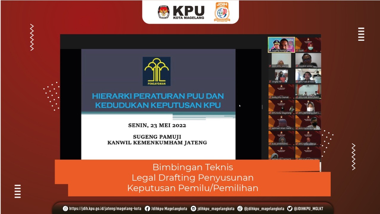 Magelang, kota-magelang.kpu.go.id. Dalam rangka peningkatan kapasitas, seluruh PNS di Lingkungan KPU Kota Magelang mengikuti Pelatihan Dasar Tata Kelola Pemilu di The Sunan Hotel Solo, Kota Surakarta, Minggu (5/6/2022), yang diselenggarakan KPU RI. Diawali pengarahan Sekjen KPU RI Drs. Bernard Dermawan Sutrisno, M.Si. secara daring, materi diklat disampaikan Dr. Nur Hidayat Sardini, S.Sos. M.Si. (Ketua Departemen Politik dan Ilmu Pemerintahan Fisip Undip), bersama tenaga ahli Setjen KPU RI. Dalam arahannya, Bernard berharap melalui diklat ini seluruh PNS KPU memiliki pemahaman penyelenggaraan pemilu yang sama. Diklat sebagai pemantapan dasar-dasar kepemiluan yang merupakan core business lembaga KPU. Nur Hidayat Sardini menyampaikan paparan materi yang meliputi dasar-dasar pemilu dan demokrasi, kesekretariatan penyelenggara pemilu independen, serta pembelajaran pengalaman dan studi kasus. Kegiatan diakhiri dengan post test sebagai evaluasi. Diklat diikuti 291 orang PNS yang berasal dari 18 satker KPU Kabupaten/Kota di Jawa Tengah. Pelatihan dilaksanakan untuk seluruh PNS KPU dalam kurun waktu sejak tanggal 2 Juni sampai dengan 21 Juni 2022.