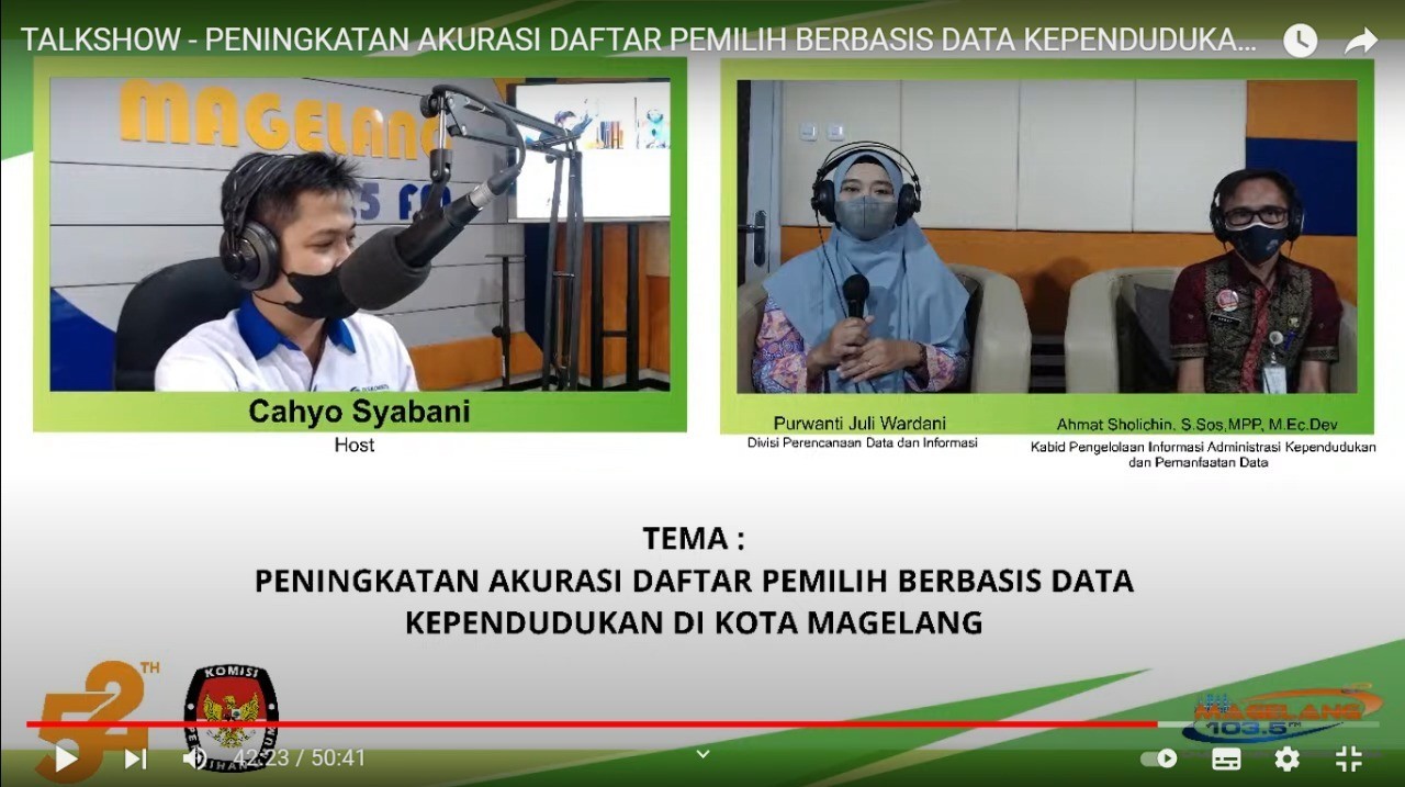 Magelang, kota-magelang.kpu.go.id. Mengambil tema “Peningkatan Akurasi Daftar Pemilih Berbasis Data Kependudukan di Kota Magelang", KPU Kota Magelang berkolaborasi dengan Disdukcapil Kota Magelang berbagi informasi dalam Talkshow Radio Magelang FM, Selasa (19/4/2022). Narasumber Anggota KPU Kota Magelang Purwanti Juli Wardani dalam talkshow menyampaikan persiapan KPU menghadapi tahapan pemilu 2024 melalui pemutakhiran data pemilih berkelanjutan serta tantangan yang dihadapi. Divisi Perencanaan, Data dan Informasi itu juga menginformasikan adanya aplikasi cek data pemilih Lindungihakmu, yang dapat diakses baik melalui website maupun mobile. Adapun Kabid Pengelolaan Informasi Adminduk dan Pemanfaatan Data Disdukcapil Kota Magelang Ahmat Solichin menjelaskan upaya Disdukcapil Kota Magelang dalam pemenuhan KTP-el, khususnya untuk persiapan pemilu serentak 2024. Ahmat juga menekankan pentingnya program nasional Gerakan Indonesia Sadar Adminduk untuk mewujudkan tertib data kependudukan. Di sela-sela talkshow, pendengar Magelang FM Dina dari Tuguran menanyakan apa yang harus ditempuh untuk pindah domisli kembali ke Kota Magelang agar terdaftar sebagai pemilih, setelah sebelumnya pindah ke luar Kota Magelang. Menutup acara, Ahmad berharap kepada masyarakat Kota Magelang untuk mewujudkan tertib adminduk, yakni terpenuhinya kelengkapan dokumen pribadi. Äpabila belum lengkap, ia mengimbau masyarakat datang ke Disdukcapil Kota Magelang untuk mendapatkan layanan secara gratis. Selanjutnya Purwanti menyampaikan imbauan agar masyarakat berpartisipasi aktif melalui cek data pemilih di aplikasi Lindungihakmu, demi akurasi data pemilih di Kota Magelang.