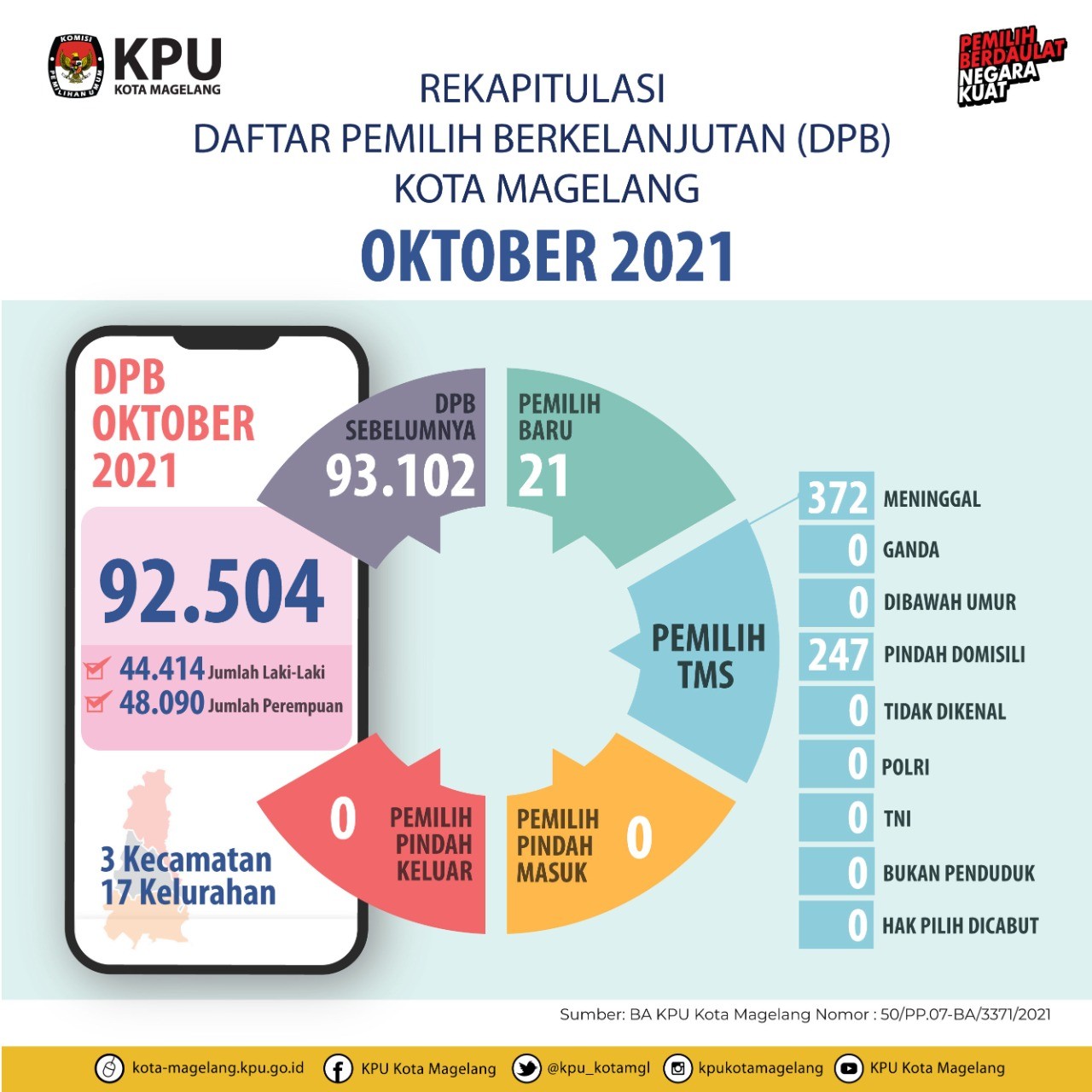 Magelang, kota-magelang.kpu.go.id. KPU Kota Magelang telah menetapkan 92.504 pemilih di Kota Magelang periode Oktober 2021, terdiri dari 44.414 pemilih laki-laki dan 48.090 pemilih perempuan. Rekapitulasi tersebut ditetapkan dalam rapat pleno yang dihadiri Ketua dan Anggota KPU Kota Magelang pada Jumat (29/10/2021). Daftar Pemilih Berkelanjutan (DPB) bulan Oktober mengalami penurunan 598 pemilih dibanding bulan sebelumnya. Berdasarkan hasil koordinasi dengan Dinas Kependudukan dan Pencatatan Sipil Kota Magelang, SMK/SMA se-Kota Magelang serta hasil pencermatan atas masukan dan tanggapan, terdapat pemilih tidak memenuhi syarat (TMS) karena meninggal sebanyak 372 pemilih dan pindah domisili sebanyak 247 pemilih. Terdapat pula jumlah pemilih baru sebanyak 21 orang. Sebelumnya pada rekapitulasi bulan September, DPB berjumlah 93.102 pemilih, terdiri dari 44.683 pemilih laki-laki dan 48.419 pemilih perempuan. Sebagaimana diketahui, mengacu pada Surat Ketua KPU RI Nomor 366/PL.02-SD/01/KPU/IV/2021 perihal Perubahan Surat Ketua KPU RI Nomor 132/PL.02-SD/01/KPU/II/2021 perihal Pemutakhiran Data Pemilih Berkelanjutan Tahun 2021 bahwa KPU melakukan Rapat Pleno Penetapan Rekapitulasi Daftar Pemilih Berkelanjutan di setiap bulan. Adapun rapat koordinasi dengan pihak terkait dilakukan setiap triwulan.