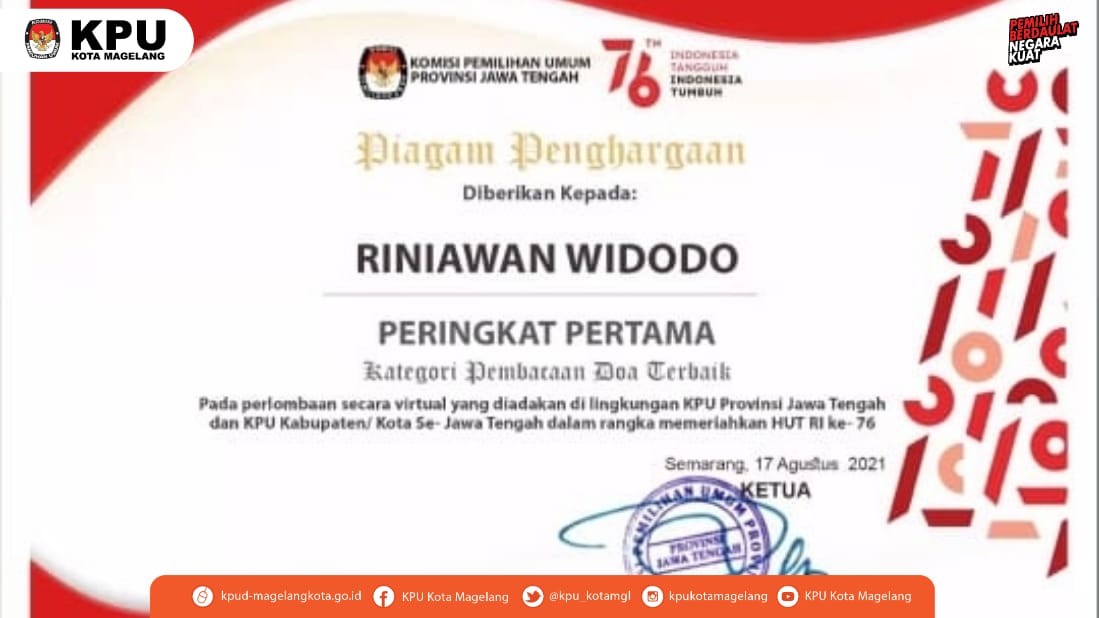 Magelang, kota-magelang.kpu.go.id. KPU Kota Magelang mengikuti Lomba Peringatan HUT RI ke-76 yang digelar KPU Provinsi Jawa Tengah sejak tanggal 10 sampai dengan 14 Agustus 2021. Jenis lomba yang diikuti meliputi Pembawa Acara/MC, Pembaca Pembukaan UUD Tahun 1945, Pembaca Doa, Menyanyikan Lagu Nasional dan Daerah serta Lomba Cipta dan Penggunaan Twibbonize. Dalam Acara Pengumuman Pemenang Lomba secara virtual, Selasa (17/8/2021), KPU Kota Magelang berhasil meraih 3 (tiga) penghargaan berikut: • Peringkat 1 Lomba Pembaca Doa (Riniawan Widodo Putro) • Peringkat 3 Lomba Pembawa Acara (Ira Wahyu CK) • Peringkat 3 Lomba Cipta dan Penggunaan Twibbonize (Yulia NK) Para pemenang mendapatkan piagam dan piala dari KPU Provinsi Jawa Tengah. Sebelumnya, di tengah acara disampaikan nama-nama ASN berprestasi di Sekretariat KPU Provinsi Jawa Tengah dan Sekretariat KPU Kabupaten/Kota. Adapun acara tersebut dibuka Ketua KPU Provinsi Jawa Tengah Yulianto Sudrajat, dengan host Yudho dan Nurhidayati.