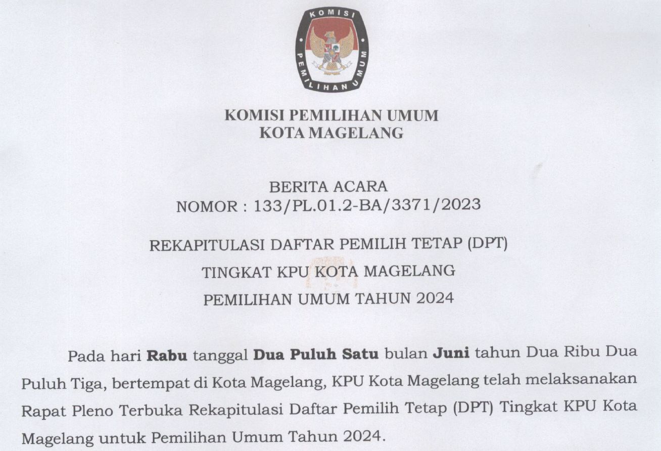 Rekapitulasi Daftar Pemilih Tetap (DPT) Tingkat Kota Magelang Pemilu 2024 Kamis, 22 Juni 2023 07:00 206 Selengkapnya klik Berita Acara Nomor : 133/PL.01.2-BA/3371/2023 tentang Rekapitulasi Daftar Pemilih Tetap (DPT) Tingkat Kota Magelang Pemilu Tahun 2024 Baca Selengkapnya