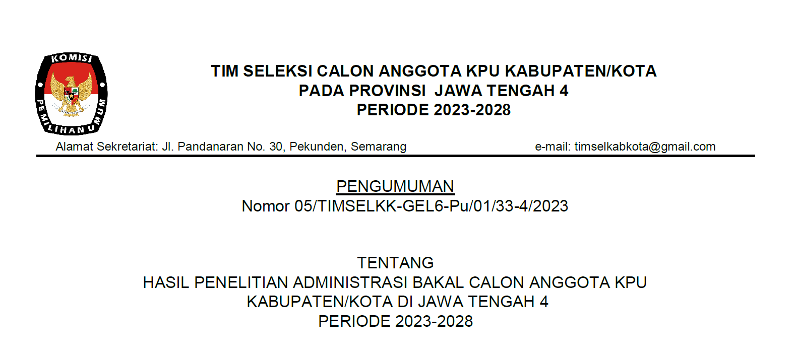 PENGUMUMAN HASIL PENELITIAN ADMINISTRASI BAKAL CALON ANGGOTA KPU KABUPATEN/KOTA DI JAWA TENGAH 4 PERIODE 2023-2028 Senin, 03 Juli 2023 07:00 213 Selengkapnya Klik PENGUMUMAN HASIL PENELITIAN ADMINISTRASI BAKAL CALON ANGGOTA KPU KABUPATEN/KOTA DI JAWA TENGAH 4 PERIODE 2023-2028 Baca Selengkapnya
