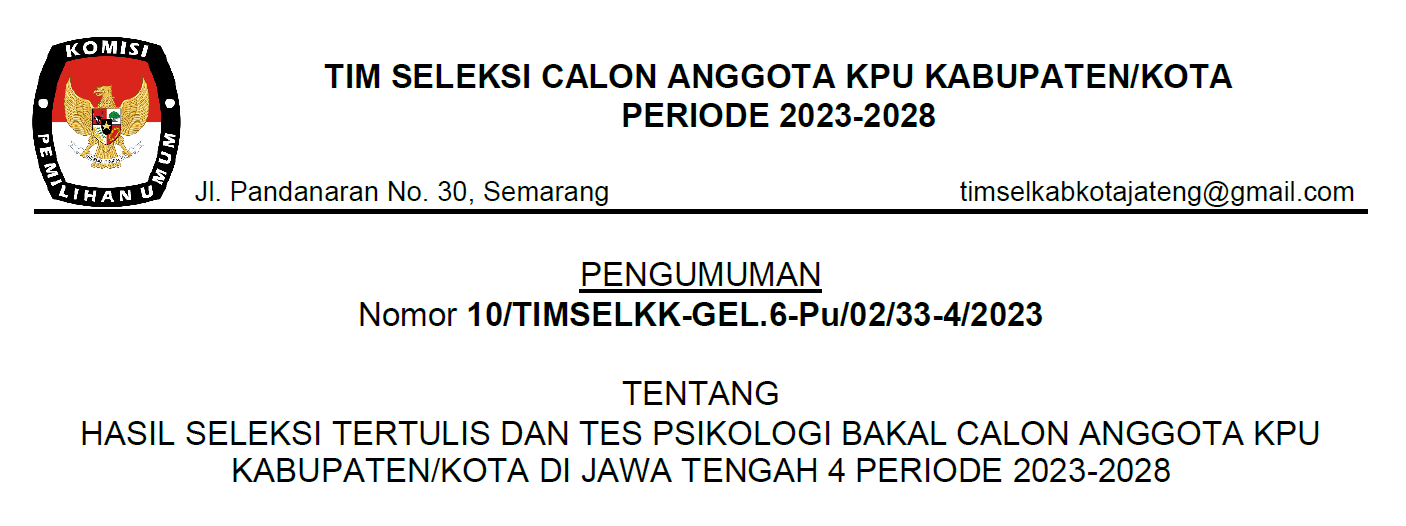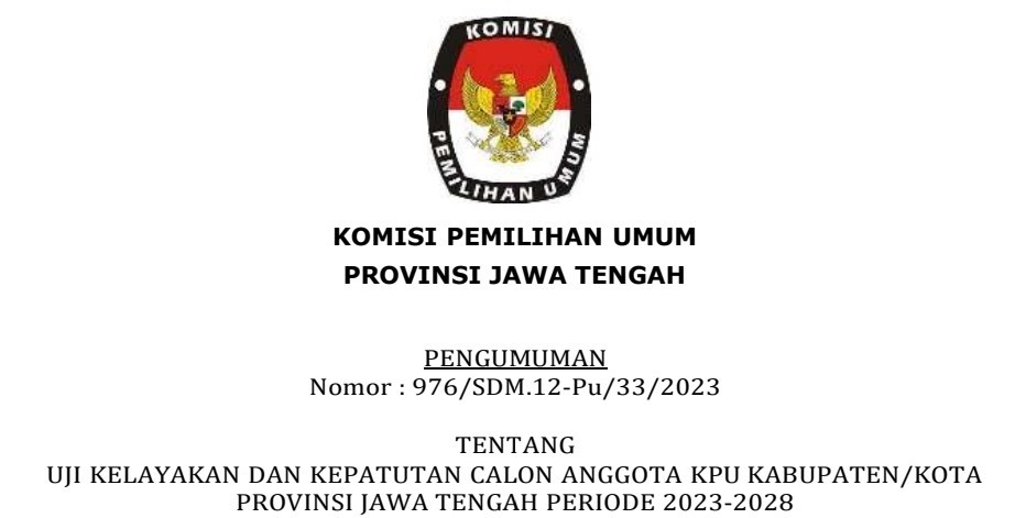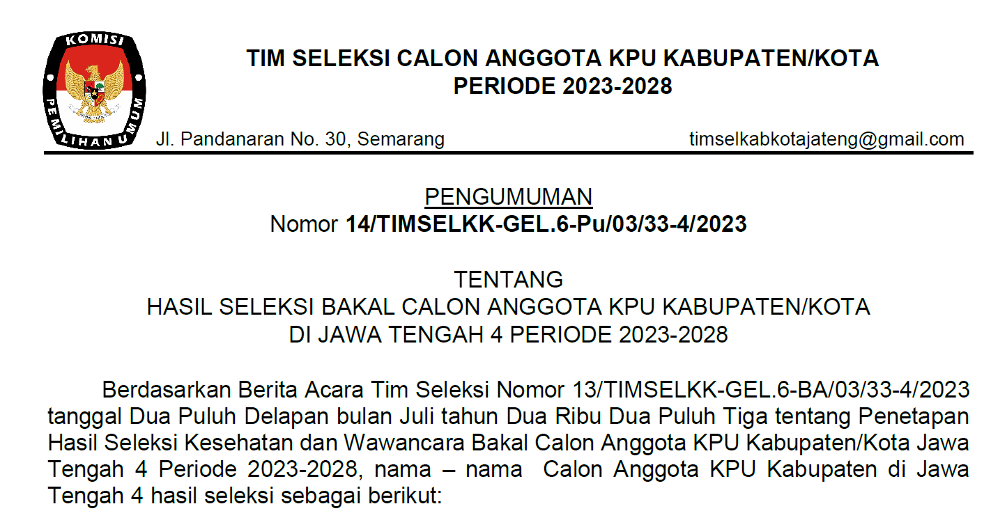 PENGUMUMAN HASIL SELEKSI BAKAL CALON ANGGOTA KPU KABUPATEN/KOTA DI JAWA TENGAH 4 PERIODE 2023-2028 Sabtu, 29 Juli 2023 07:00 201 Selengkapnya Klik PENGUMUMAN HASIL SELEKSI BAKAL CALON ANGGOTA KPU KABUPATEN/KOTA DI JAWA TENGAH 4 PERIODE 2023-2028 Baca Selengkapnya