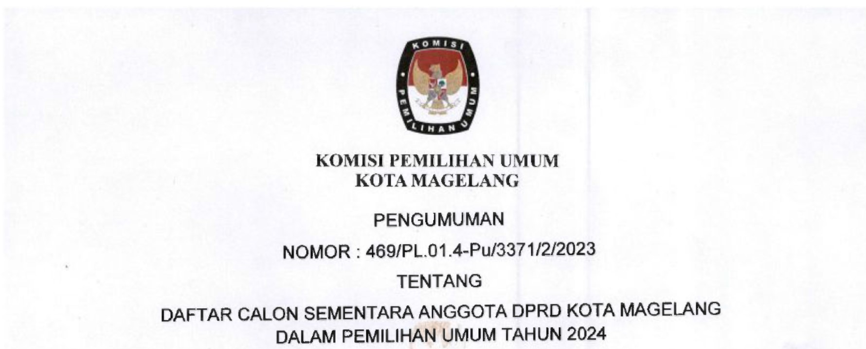 PENGUMUMAN CALON SEMENTARA ANGGOTA DPRD KOTA MAGELANG DALAM PEMILIHAN UMUM TAHUN 2024 Sabtu, 19 Agustus 2023 05:00 1843 Selengkapnya klik Pengumuman Calon Sementara Anggota DPRD Kota Magelang Dalam Pemilihan Umum Tahun 2024 disini Baca Selengkapnya