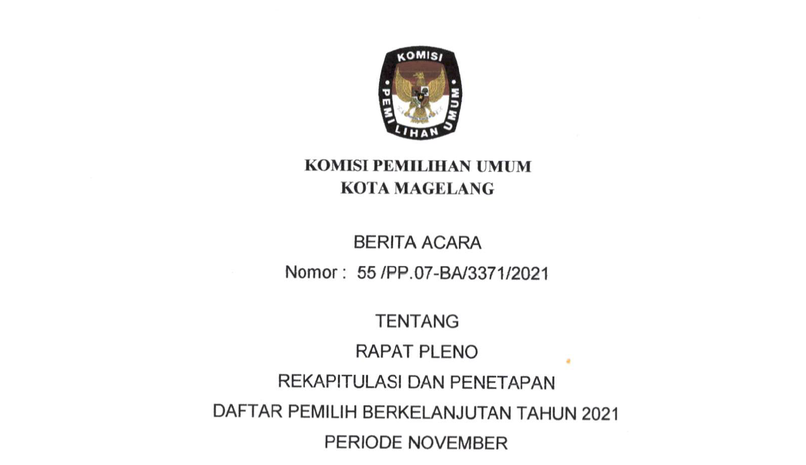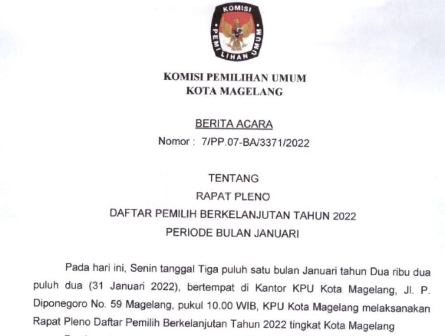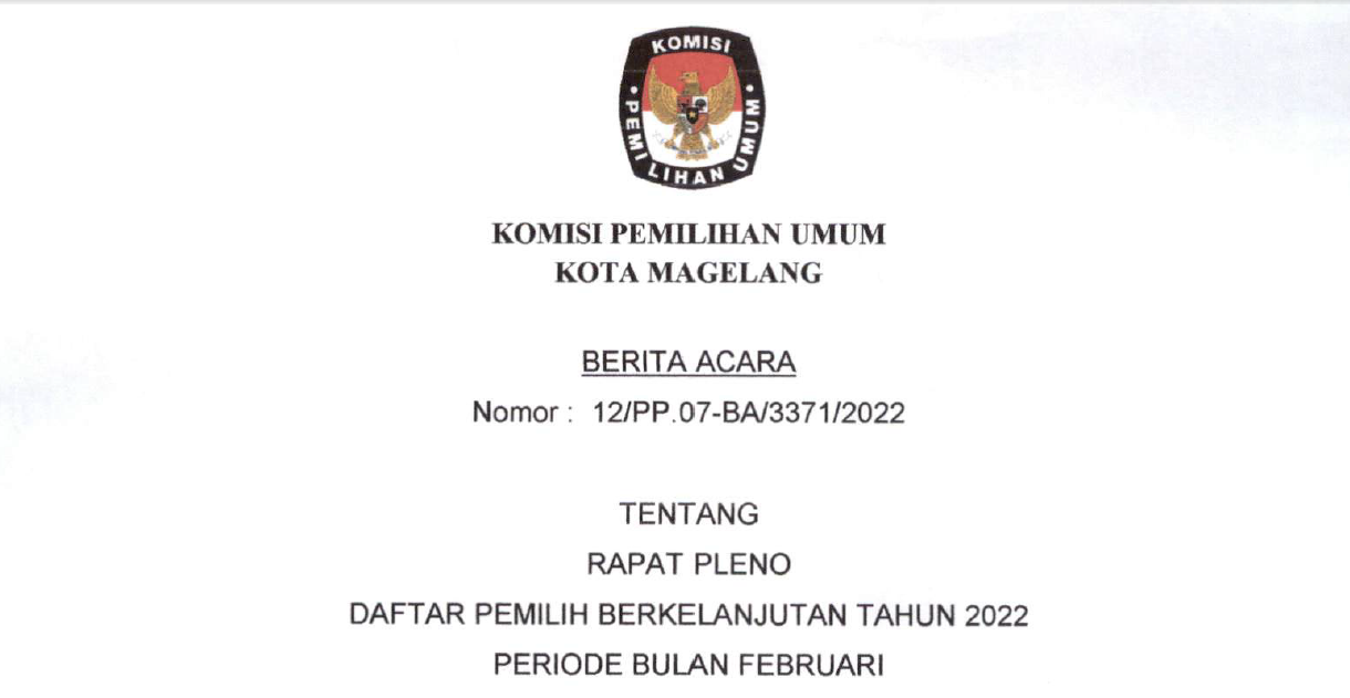 Berita Acara Rapat Pleno Rekapitulasi Dan Penetapan Daftar Pemilih Berkelanjutan Tahun 2021 Periode November Selasa, 30 November 2021 20:21 736 Selengkapnya Klik Berita Acara Nomor : 55/PP.07-BA/3371/2021 tentang Rapat Pleno Rekapitulasi Dan Penetapan Daftar Pemilih Berkelanjutan Tahun 2021 Periode November Baca Selengkapnya