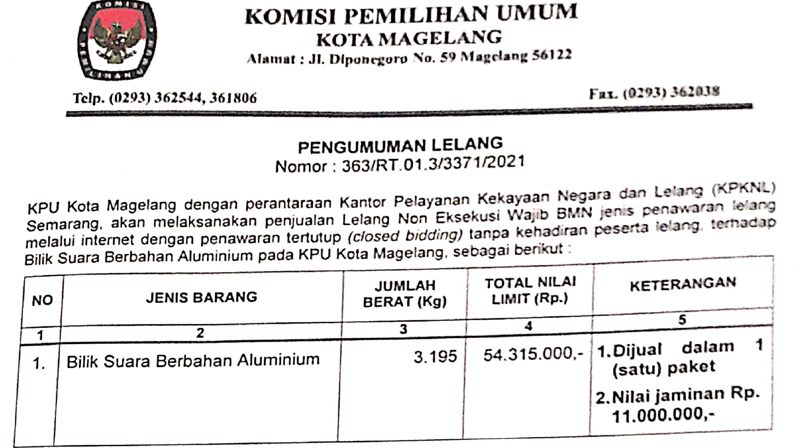 Lelang Bilik Suara Berbahan Aluminium pada KPU Kota Magelang Senin, 13 Desember 2021 20:21 369 Selengkapnya Klik Lelang Bilik Suara Berbahan Aluminium pada KPU Kota Magelang Baca Selengkapnya