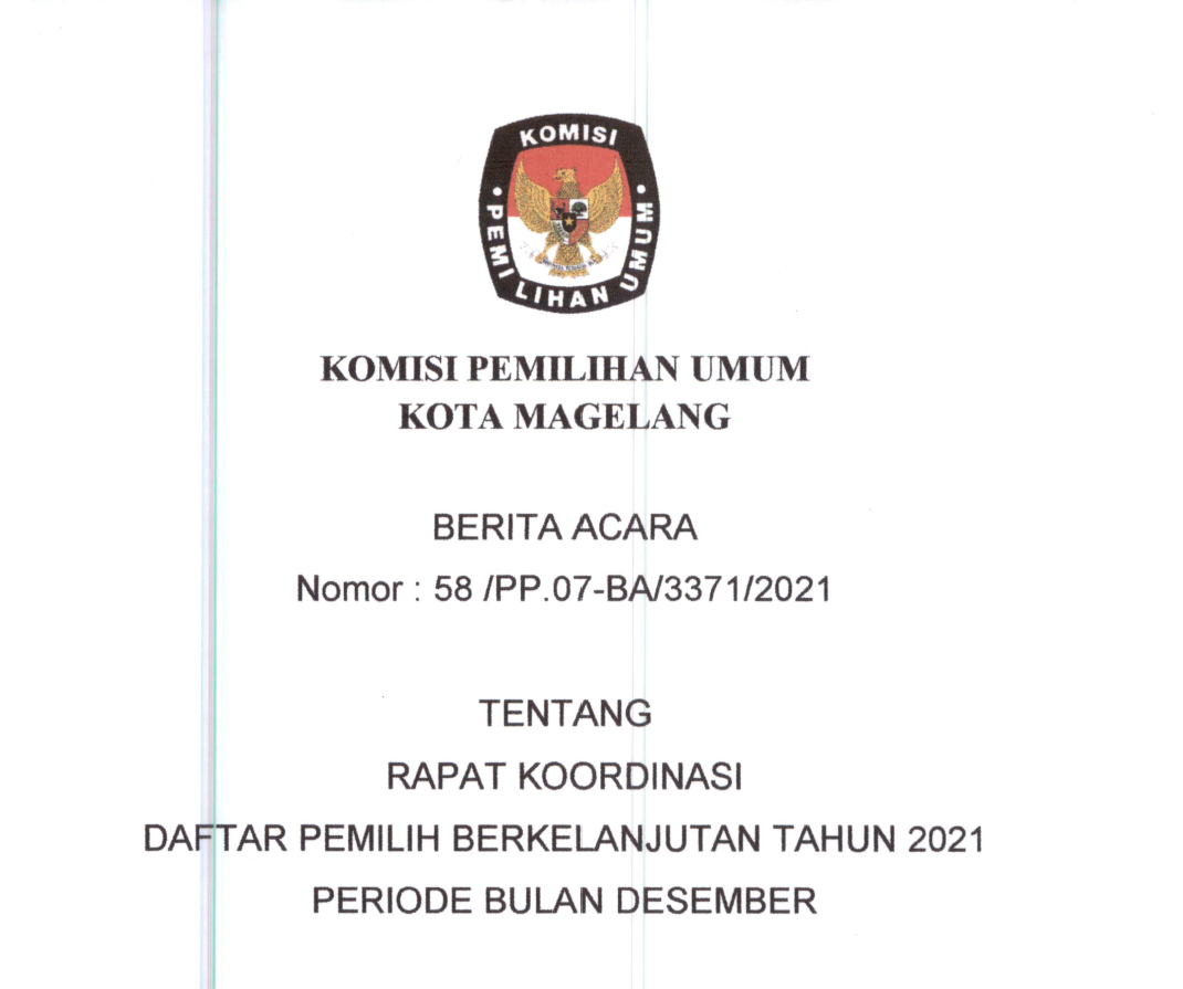 Berita Acara Rapat Koordinasi Daftar Pemilih Berkelanjutan Tahun 2021 Periode Bulan Desember Jumat, 24 Desember 2021 20:21 757 Selengkapnya Klik Berita Acara Nomor 58/PP.07-BA/3371/2021 tentang Rapat Koordinasi Daftar Pemilih Berkelanjutan Tahun 2021 Periode Bulan Desember Baca Selengkapnya