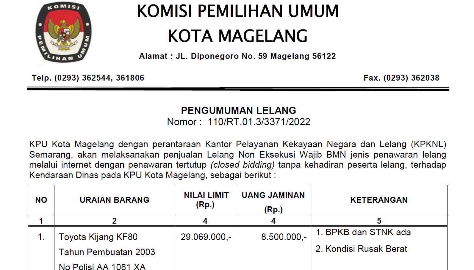 LELANG KENDARAAN DINAS PADA KPU KOTA MAGELANG Senin, 21 Maret 2022 20:22 443 Selengkapnya Klik Pengumuman Lelang Kendaraan Dinas Pada KPU Kota Magelang Baca Selengkapnya