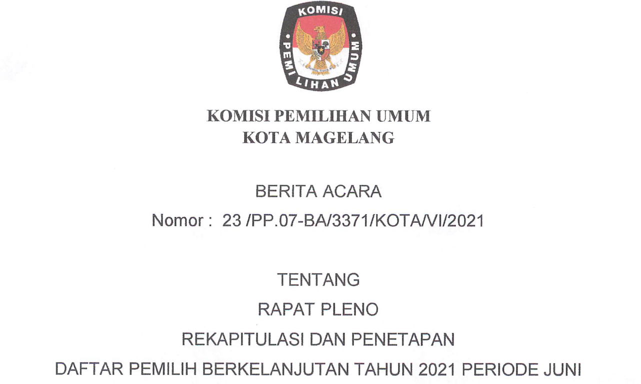 Klik Berita Acara Nomor: 23/PP.07-BA/3371/KOTA/VI/2021 tentang Rapat Pleno Rekapitulasi dan Penetapan Daftar Pemilih Berkelanjutan Tahun 2021 Periode Juni