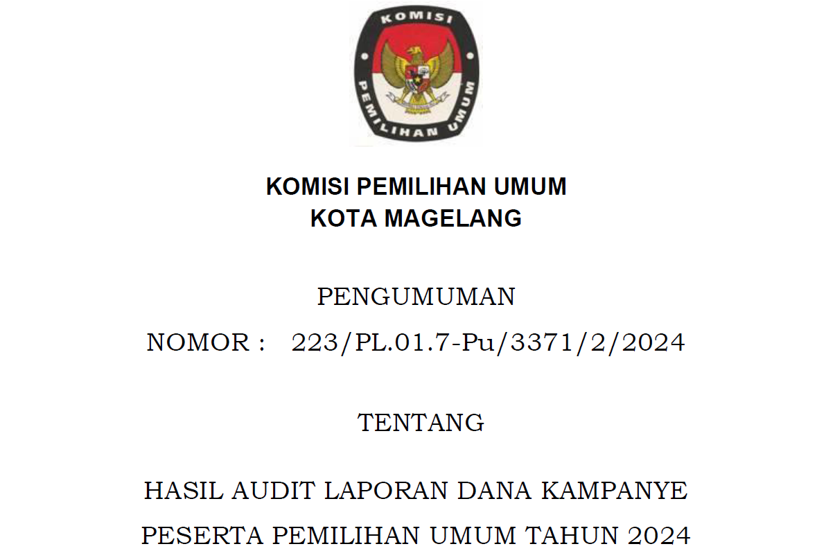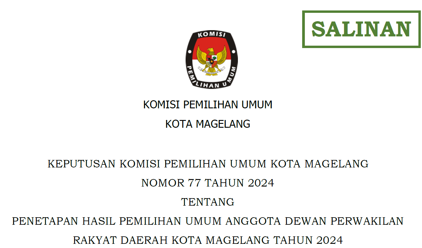 PENETAPAN PEROLEHAN KURSI PARTAI POLITIK PESERTA PEMILIHAN UMUM ANGGOTA DEWAN PERWAKILAN RAKYAT DAERAH KOTA MAGELANG DALAM PEMILIHAN UMUM TAHUN 2024, KLIK DISINI