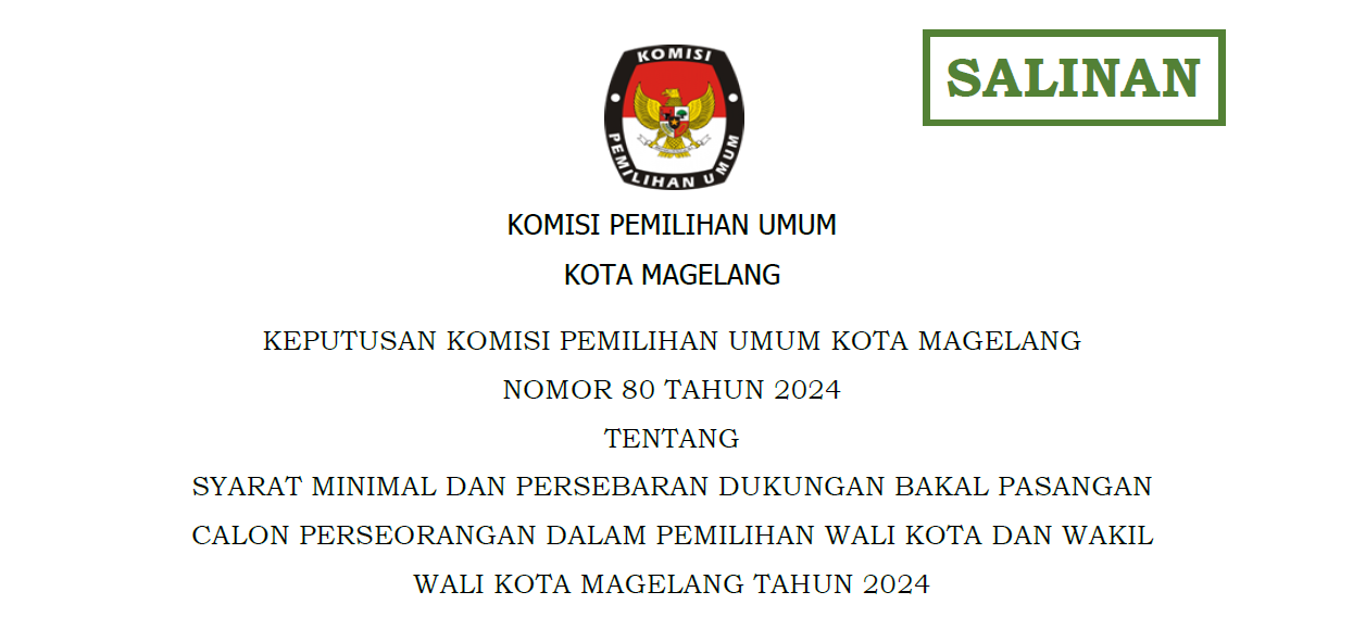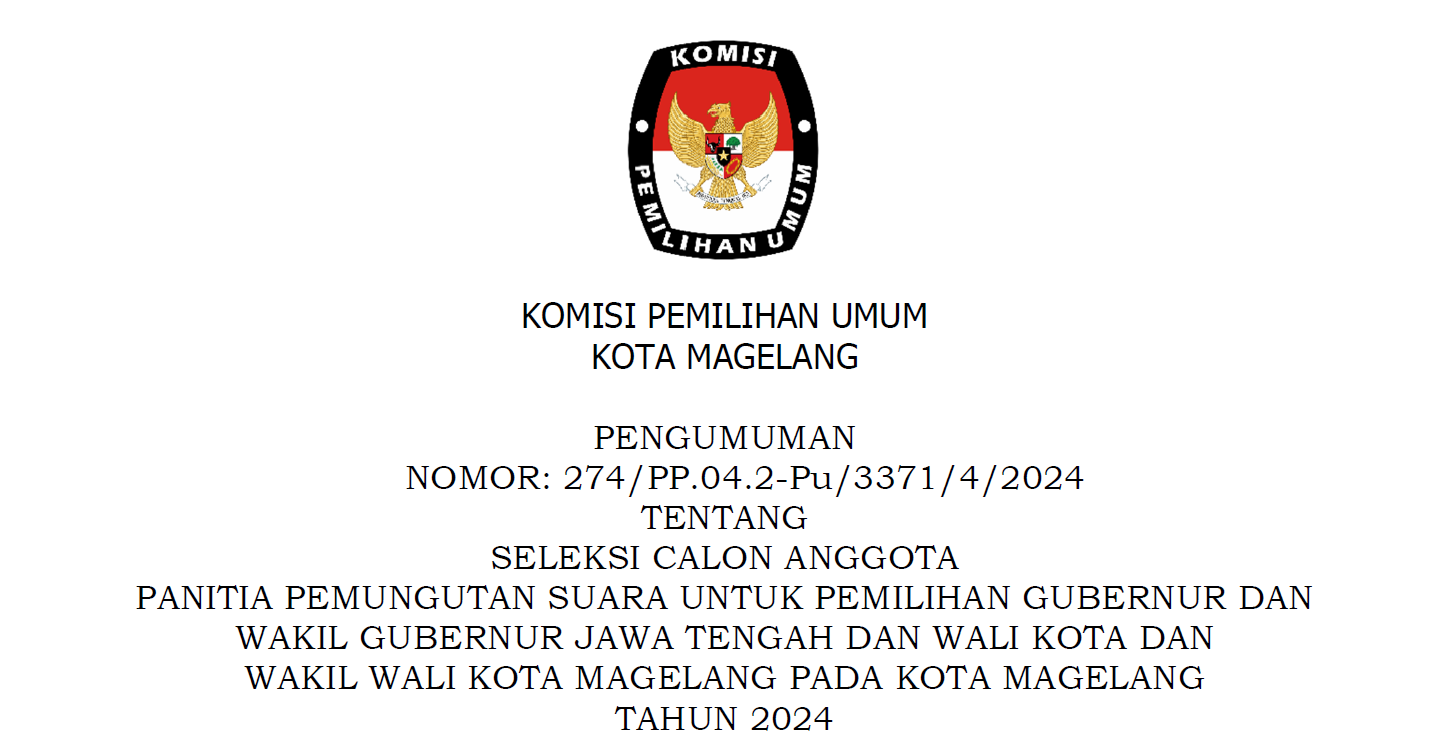 - SELEKSI CALON ANGGOTA PANITIA PEMUNGUTAN SUARA UNTUK PEMILIHAN GUBERNUR DAN WAKIL GUBERNUR JAWA TENGAH DAN WALI KOTA DAN WAKIL WALI KOTA MAGELANG PADA KOTA MAGELANG TAHUN 2024, KLIK DISINI